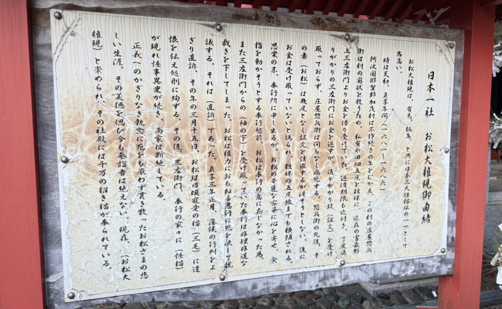 江戸時代、那賀(なか)郡加茂(かも)町【現在「阿南市加茂(かも)町」】の庄屋の妻・お松が、夫から土地を騙し取った富豪(ふごう)や奉行の非理非道な企(たくら)みに死を決して直訴(じきそ)し、愛猫とともに処刑されました。